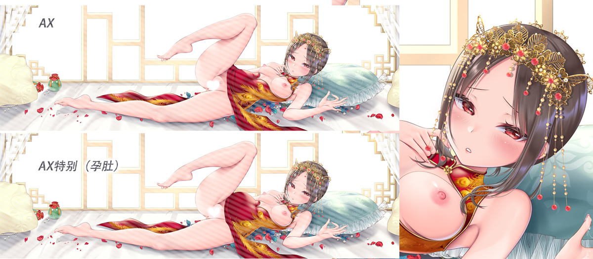 AX/BX —— R18版,害羞表情,有少量液体,裸露。BX版(花园婚纱)增加 隐藏版“头纱版“,该本版需备注。